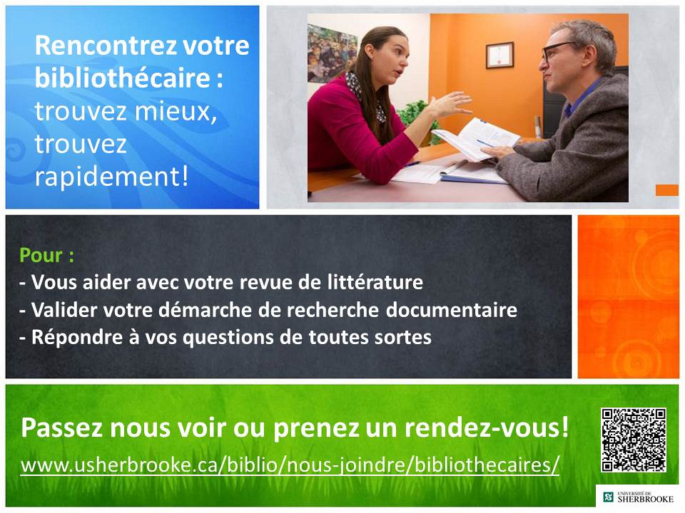Vous tournez en rond dans vos recherches? Vous n'êtes pas certain que vous cherchez au bon endroit? Vous aimeriez discuter des mots-clés à utiliser? Vous souhaitez valider votre démarche avec quelqu'un de compétent? Vous désirez en savoir plus sur la fiabilité de vos sources et sur les risques de plagiat par erreur? Prenez rendez-vous avec votre bibliothécaire en cliquant sur le lien ci-dessous!