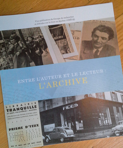« Entre l'auteur et le lecteur : l'archive » propose une plongée au cœur de l'histoire littéraire du Québec, depuis le milieu du XXe siècle. Basée surtout sur le fonds des Éditions Fides[1] et, en appui, sur les fonds des Éditions de l’Hexagone, Anne Hébert, Henri Tranquille et Jean Simard, l’exposition a montré que les pièces que laissent derrière eux les gens du livre chuchotent des paroles enfouies qui, une fois réunies, dévoilent les secrets de la fabrication du livre et du message qu'il véhicule.