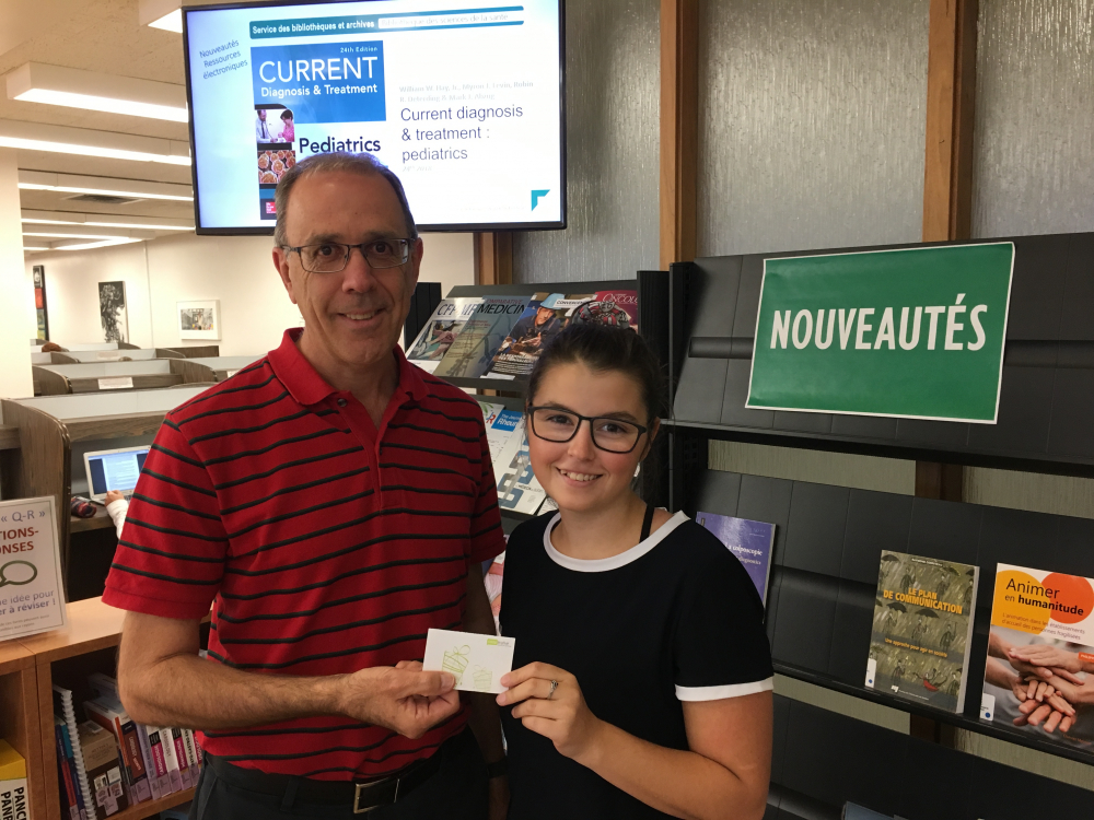 La remise du prix a eu lieu en présence de monsieur Pierre Adant, directeur de la Bibliothèque des sciences de la santé et de la Bibliothèque du Frère-Théode, et monsieur Sylvain Champagne, directeur du Carrefour de l’information de Longueuil et de la Bibliothèque de droit.