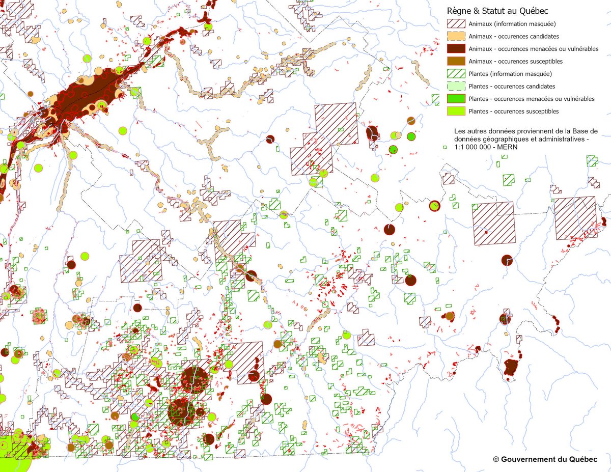 Cette couche représente l'ensemble des occurrences floristiques et fauniques en situation précaire du Centre de données sur le patrimoine naturel du Québec (CDPNQ). La publication de ces données a pour but d'améliorer leur accessibilité pour la clientèle, de favoriser la prise en compte des espèces dans les projets d'aménagement du territoire et, enfin, de faciliter l'échange d'information avec les utilisateurs. Afin d'éviter que la diffusion des données ne cause un préjudice à certaines espèces ou à leur habitat, le CDPNQ a choisi de masquer des informations. Ce choix est basé sur une analyse de la sensibilité des espèces à la diffusion d'information les concernant.
