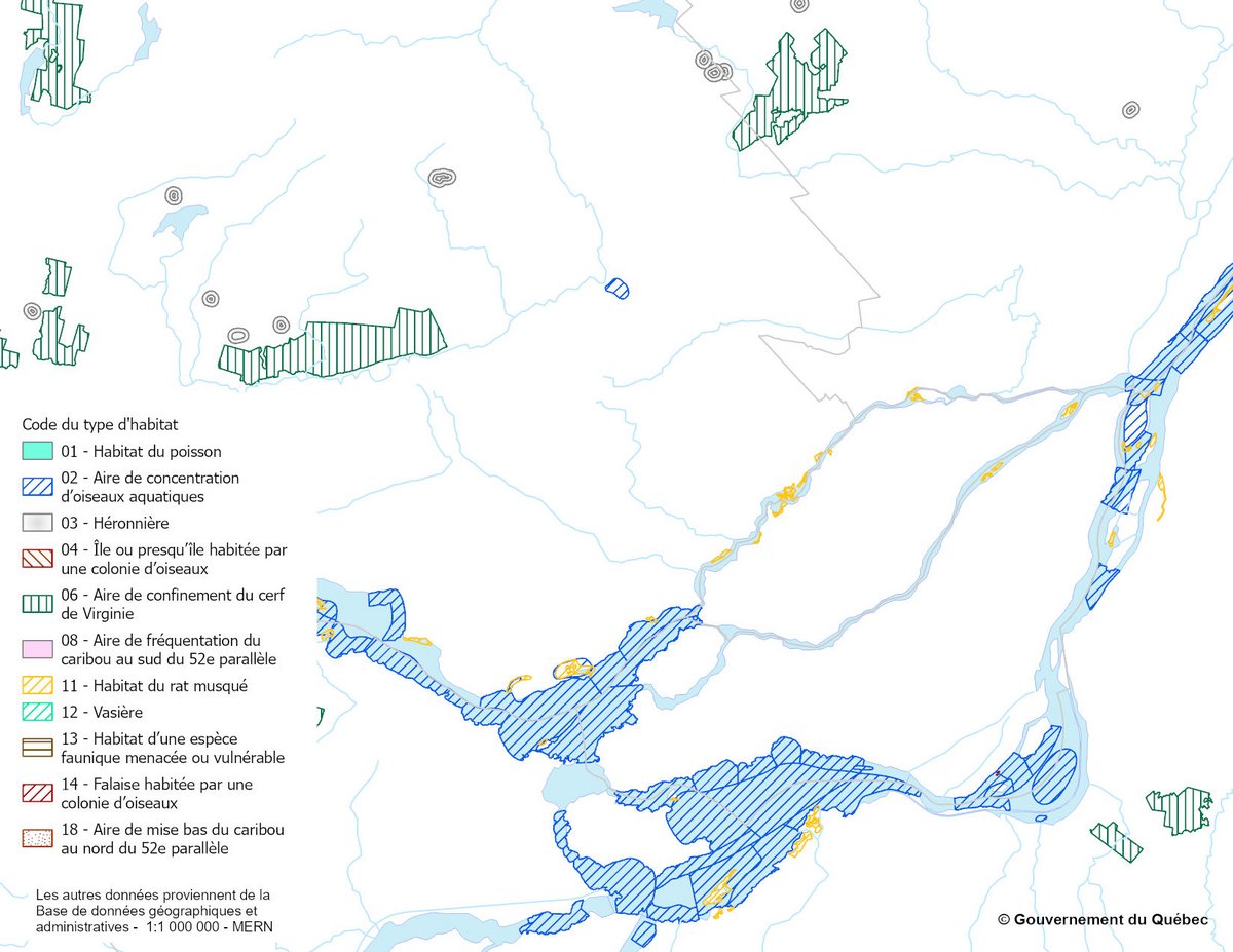 Les types d'habitats fauniques cartographiés sont les suivants : aire de concentration d'oiseaux aquatiques, aire de confinement du cerf de Virginie, aire de fréquentation du caribou au sud du 52e parallèle, falaise habitée par une colonie d'oiseaux, habitat du poisson, habitat du rat musqué, habitat d’une espèce vulnérable ou menacée, héronnière, île ou presqu'île habitée par une colonie d'oiseaux et vasière.