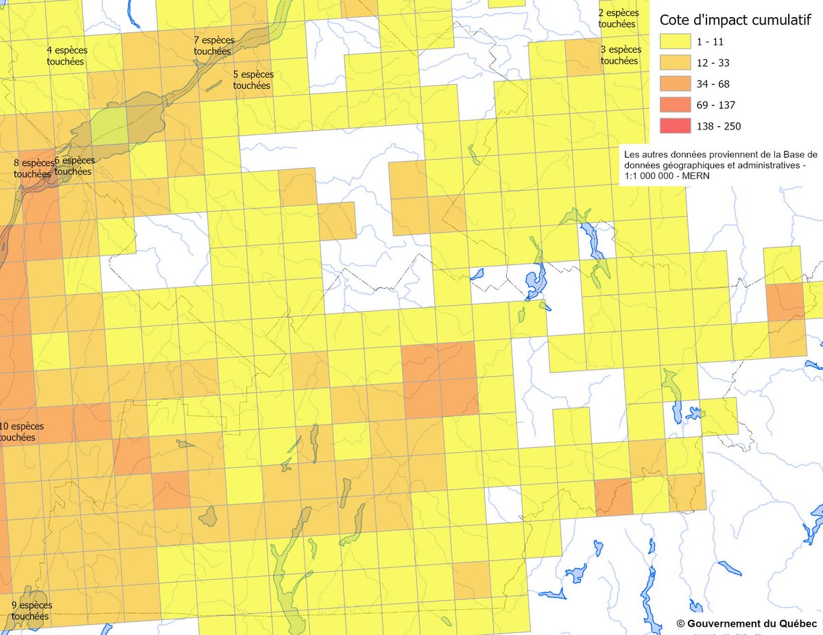 Ces données mettent en relief les secteurs où les impacts des menaces sur les occurrences répertoriées par le Centre de données sur le patrimoine naturel du Québec (CDPNQ) sont les plus importants. Les menaces sont des activités qui, par leur emplacement, leur intensité ou le moment où elles surviennent, génèrent un stress (voir la section suivante) qui affecte les éléments de la biodiversité.
