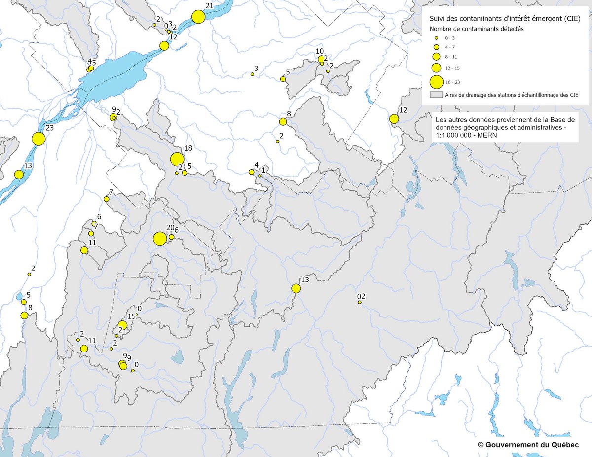 Cette thématique présente la localisation des échantillonnages de contaminants d’intérêt émergent (CIE) réalisés par la direction générale du suivi de l’état de l’environnement (DGSEE) dans le cadre de ses travaux depuis 2000. Chaque station est accompagnée d’un lien dans la table attributaire permettant au lecteur d’accéder à un fichier Excel présentant les concentrations de CIE détectés, la liste des CIE analysés au moins une fois à la station, la liste des rapports produits à partir des échantillonnages effectués à la station, ainsi que des informations sur les critères de qualité d’eau de surface pour la protection de la vie aquatique.