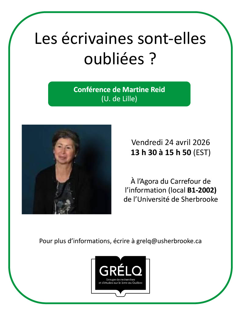 Le Groupe de recherches et d'études sur le livre au Québec (GRÉLQ) vous invite à la conférence de Martine Reid, qui s’intitule « Les écrivaines sont-elles oubliées ? » et qui aura lieu le vendredi 14 avril 2026, de 13 h 30 à 15 h 50 (EST). L’événement se déroulera à l'Agora du Carrefour de l'information (local B1-2002) de l’Université de Sherbrooke.