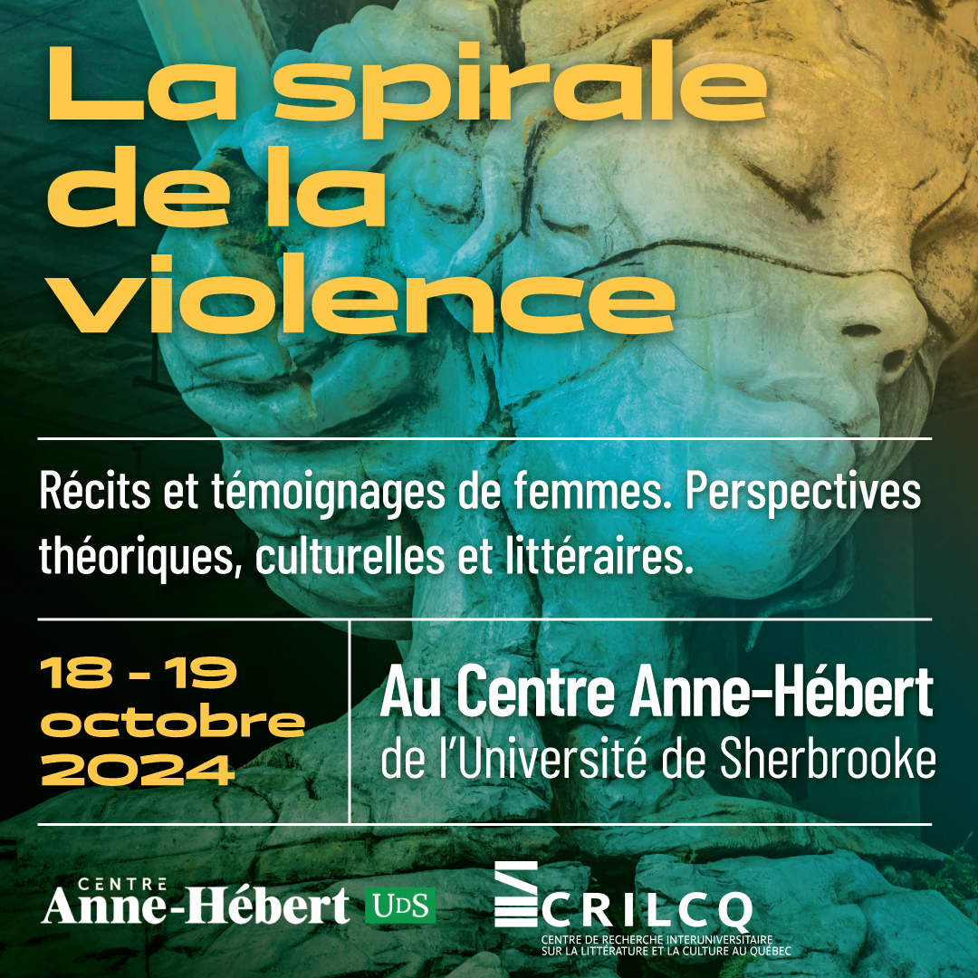 Le Centre Anne-Hébert, en partenariat avec le CRILCQ, présente le colloque « La spirale de la violence : récits et témoignages de femmes. Perspectives théoriques, culturelles et littéraires », placé sous la responsabilité scientifique de Nicoletta Dolce (Université de Montréal) et Evelyne Gagnon (Université du Québec à Trois-Rivières).