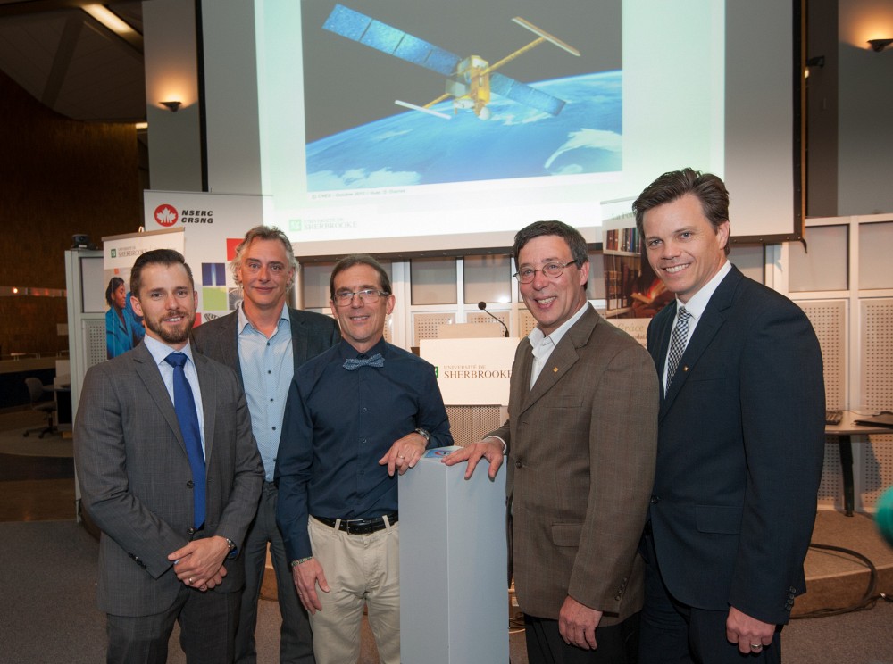 Bruno Benedetti d’Énergie Brookfield et Jocelyn Gaudet d’Hydro-Québec accompagnent le titulaire de la chaire Robert Leconte, le vice-recteur à la recherche et aux études supérieures de l’UdeS Jean-Pierre Perreault et le doyen de la Faculté de génie Patrik Doucet.
