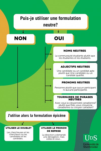 Miroir de notre société, la langue se révèle l'un des terrains sur lesquels lutter contre l'exclusion. Portée par les principes d’équité, de diversité et d’inclusion pour l’ensemble de sa communauté universitaire, l’UdeS prône l’utilisation de la rédaction inclusive dans ses communications. C’est dans cette perspective qu’elle a révisé son guide de rédaction épicène, de manière à mieux représenter les membres de sa communauté sans biais, discrimination ou préjugé.