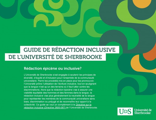 Le nouveau Guide de rédaction inclusive, qui se base sur les recommandations de l’Office québécois de la langue française (OQLF), privilégie l’emploi d’une langue qui soit plus neutre et qui recourt à des formes favorisant la lisibilité des textes. Il présente différents outils et exemples pour améliorer les pratiques de rédaction inclusive, et s'adresse à toutes les personnes de l’UdeS appelées à communiquer auprès de leurs pairs.