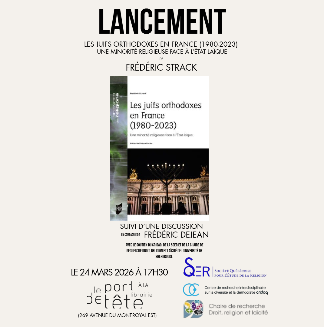 Le professeur Frédéric Dejean (UQAM), président de la Société québécoise pour l'étude de la religion (SQER), sera le discutant.