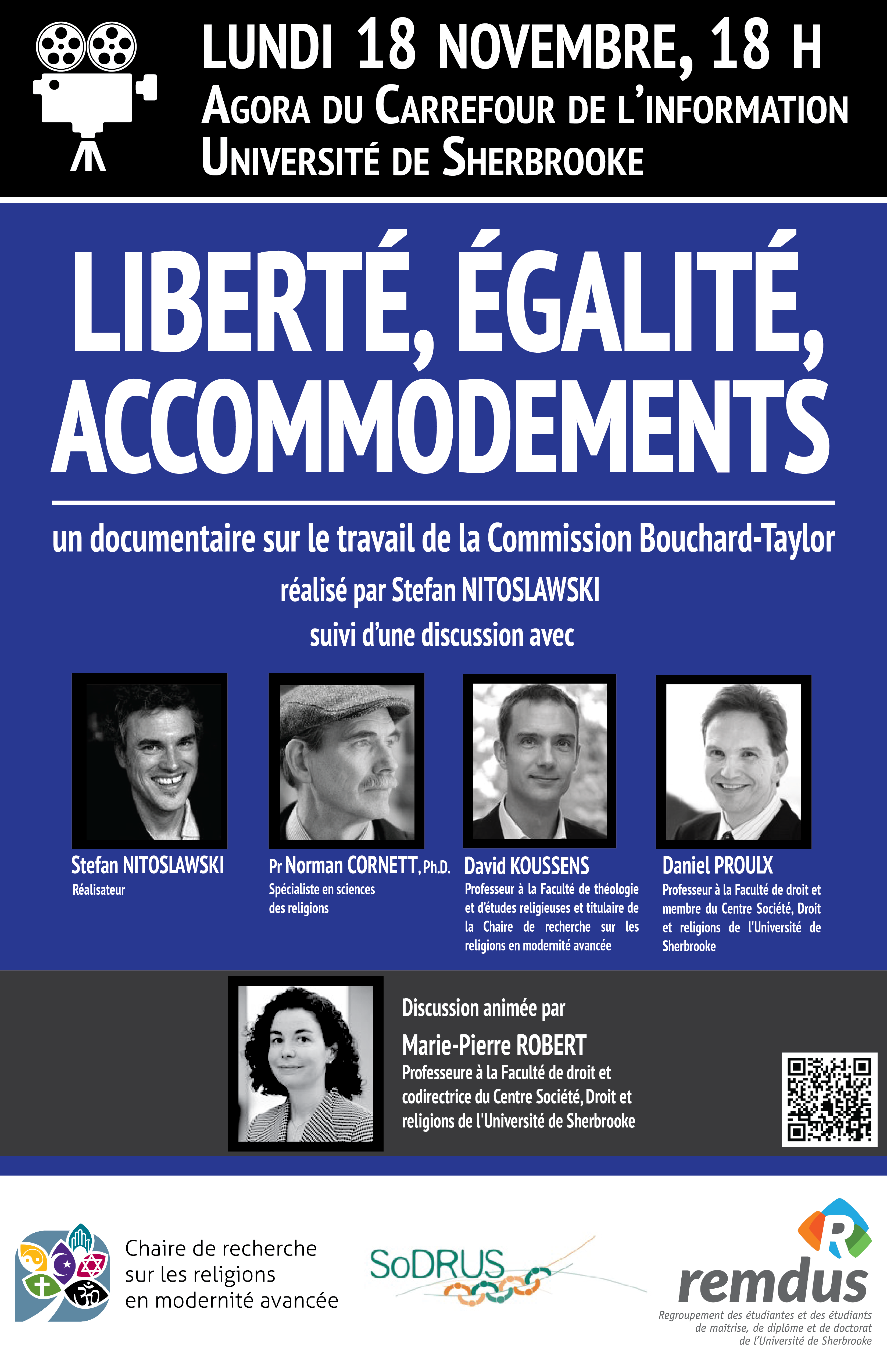 En collaboration avec le centre société, droit et religions de l'Université de Sherbrooke Sodrus et avec le REMDUS, la chaire organise une discussion autour du documentaire liberté, égalité, accommodements, réalisé par Stephan Nitoslawski, sur le travail de la Commission Bouchard-Taylor.