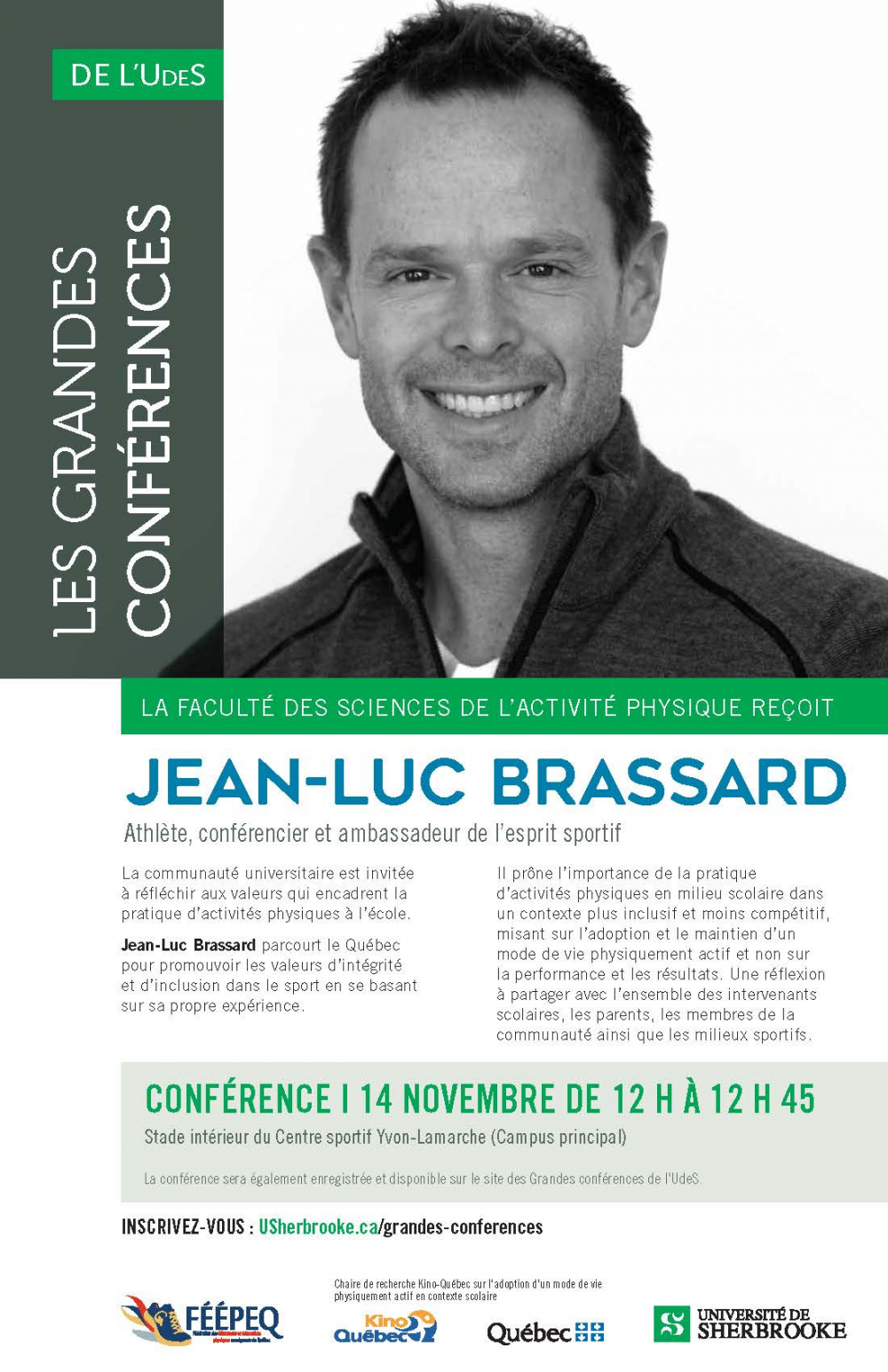 La Chaire de recherche Kino-Québec collabore aux Grandes conférences de l'UdeS. Le 24 novembre 2019, Jean-Luc Brassard sera le conférencier invité. Connu d’abord pour ses exploits en ski acrobatique, celui-ci parcourt maintenant le Québec pour promouvoir les valeurs d’intégrité et d’inclusion dans le sport en se basant sur sa propre expérience.