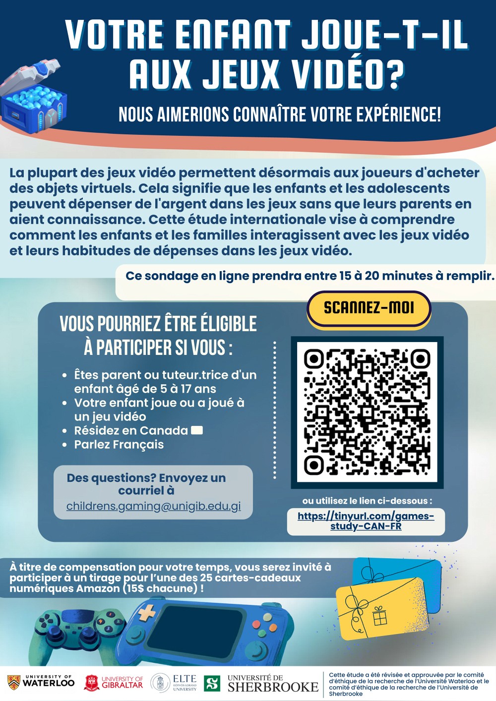 Dans le cadre d'une étude collaborative de portée internationale mise sur pied par Dr Dillon Browne (Université de Waterloo), nous nous intéressons aux comportements et aux habitudes d'achat liés aux jeux vidéo (monétisation) chez les enfants de 5 à 17 ans. Ce projet d'envergure est réalisé en collaboration avec des chercheurs internationaux provenant de plus de 20 pays à travers le monde, notamment Dr Zsolt Demetrovics (Université de Gibraltar, Université ELTE Eötvös Loránd), Dre Orsolya Király (Université ELTE Eötvös Loránd), Dre Andrea Czakó (Université de Gibraltar, Université ELTE Eötvös Loránd) et Jasmine Zhang (Université de Waterloo). L'étude permettra d'en apprendre davantage sur la prévalence des comportements d'achat dans les jeux vidéo réalisés par des mineurs, ainsi que sur les connaissances parentales liées à ce phénomène. Les données seront analysées pour chaque pays, ainsi que pour réaliser des comparaisons entre pays. La Pre Caroline Fitzpatrick tient le rôle, en collaboration avec son étudiante Marie-Andrée Binet, de collaboratrice désignée pour le Canada francophone.