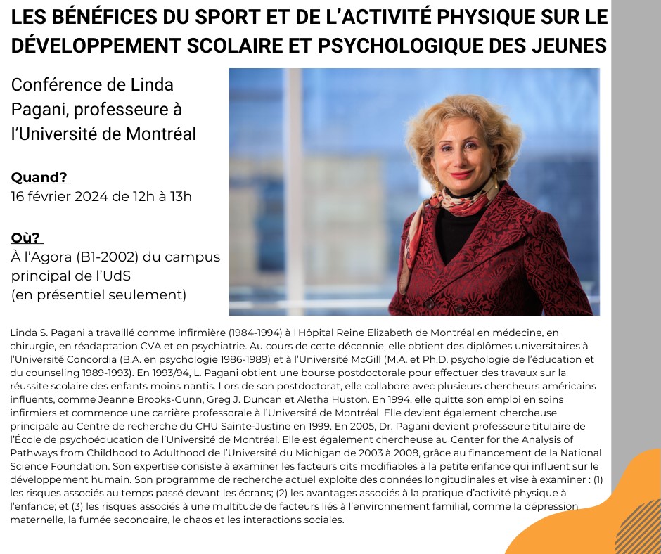 La Chaire de recherche du Canada sur la préparation à l’école, l’inclusion des populations vulnérables et l’adaptation sociale, la Chaire de recherche du Canada sur le vivre-ensemble, les médias numériques et les enfants: vision écosystémique et le GRISE vous invitent à un midi-conférence le vendredi 16 février 2024 de 12h00 à 13h00.intitulé « Les bénéfices du sport et de l’activité physique sur le développement scolaire et psychologique des jeunes », par la professeure Linda S. Pagani de l’École de psychoéducation de l’Université de Montréal.