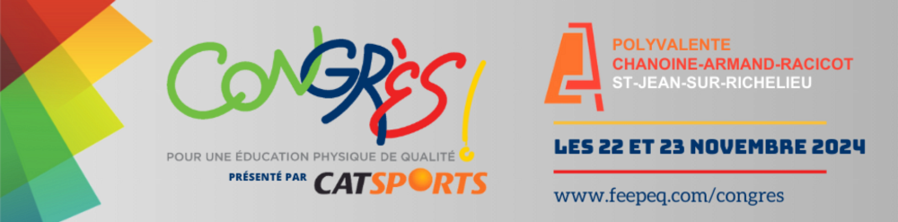La Fédération des éducateurs et éducatrices physiques enseignants du Québec (FÉÉPEQ) tiendra à St-Jean-sur-Richelieu les 22 et 23 novembre 2024 son congrès annuel Pour une Éducation Physique de Qualité! Cette année, le congrès aura pour thématique: "Vers une prise en charge autonome et responsable de l'élève".