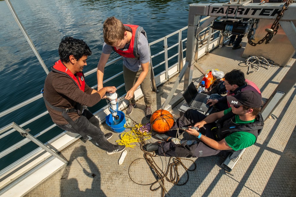 Une équipe d’étudiantes et d’étudiants de la Faculté de génie, sous la direction du professeur Michael Canva, du professeur Denis Vachon et de la professeure Céline Guéguen, travaille à la préparation d’un appareil de prélèvements d’échantillons d’eau pour répertorier et faire l’analyse des contaminants dans le lac. Cet instrument permettra d’échantillonner l’eau du lac toute l’année, y compris en hiver.