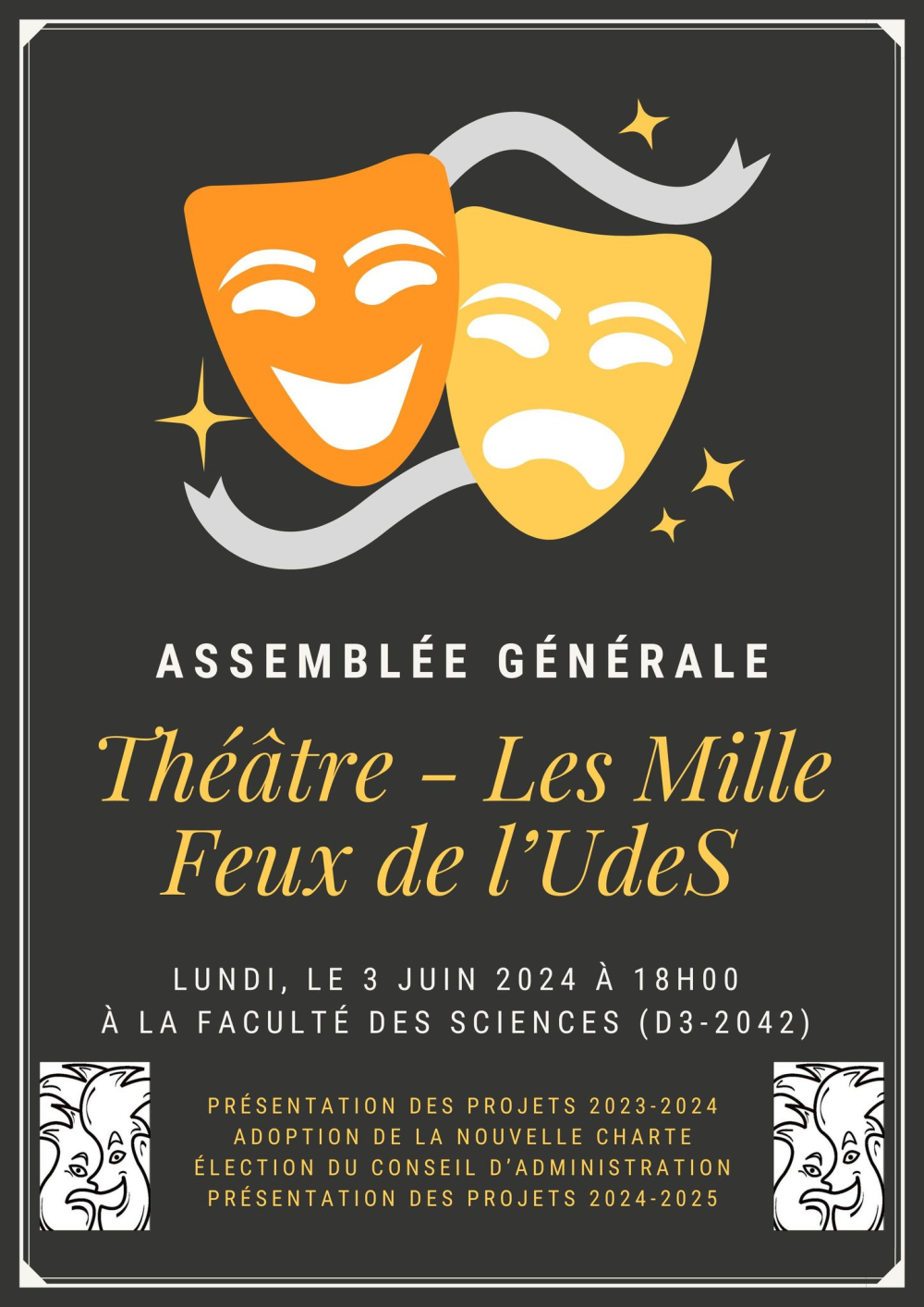 L'assemblée générale annuelle du Théâtre - Les Mille Feux de l'UdeS aura lieu le 3 juin prochain dès 18 h. À l'ordre du jour :