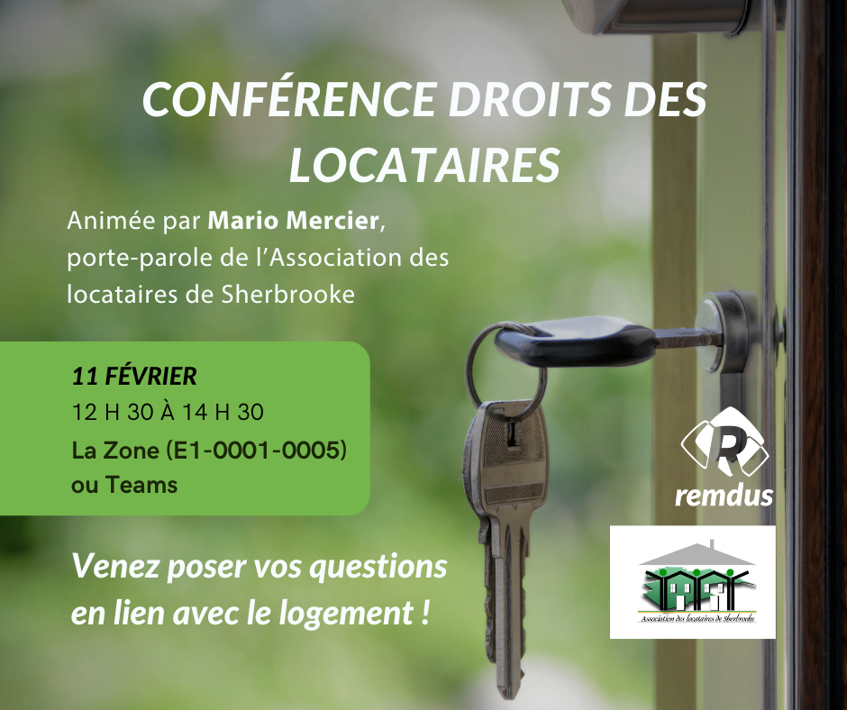 Le REMDUS s'associe avec l'Association des locataires de Sherbrooke (ALS) pour offrir une conférence sur les droits en tant que locataire.