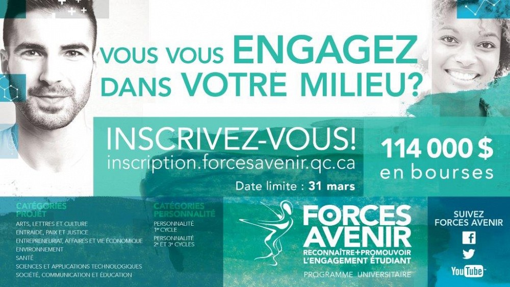 Vous êtes engagé dans votre milieu? Vous consacrez temps et ressources à un projet ou à une organisation qui vous tient à cœur? L’engagement donne un sens à votre vie? Vous êtes un candidat parfait pour Forces Avenir! Si vous êtes un étudiant inscrit à temps plein ou reconnu comme tel, sortez de l’ombre et soumettez votre candidature. Il ne manque que VOUS!