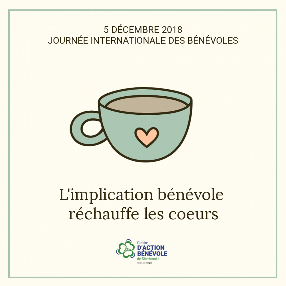 Le 5 décembre entre 11 h 30 et 13 h, à l’occasion de la Journée internationale des bénévoles, l’équipe du Centre d’action bénévole de Sherbrooke distribuera gratuitement du chocolat chaud devant le Pavillon multifonctionnel de l’Université de Sherbrooke.
