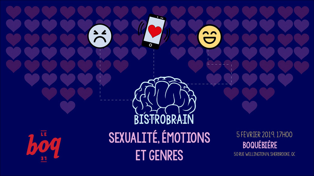 Le 5@7 de BistroBrain aura lieu le 5 février à 17 h au Boquébière. Sous le thème la sexualité, les émotions et les genres, des étudiantes et étudiants de l'UdeS ainsi que des membres du corps professoral viendront vous présenter leur projet de recherche de façon vulgarisée en lien avec cette thématique. C'est l'occasion de poser toutes vos questions aux personnes expertes sur place.