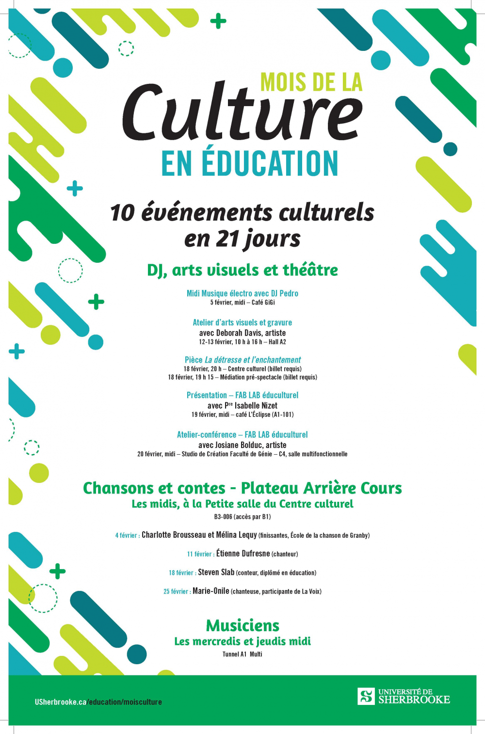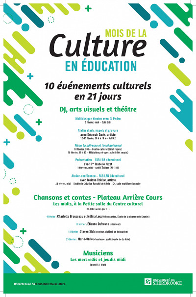 Du 4 au 25 février 2020, c'est le Mois de la culture en éducation! Profitez d'une foule d'activités et de spectacles gratuits dans la Faculté d'éducation et dans les tunnels de l'UdeS.