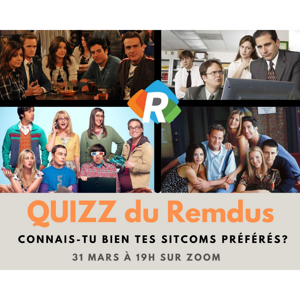 Le REMDUS invite tous ses membres à son quiz virtuel Connais-tu bien tes sitcoms préférés? qui aura lieu le mercredi 31 mars de 19 h à 20 h. Les séries The Office, F.R.I.E.N.D.S, The Big Bang Theory et How I Met Your Mother seront à l'honneur lors de cette soirée!