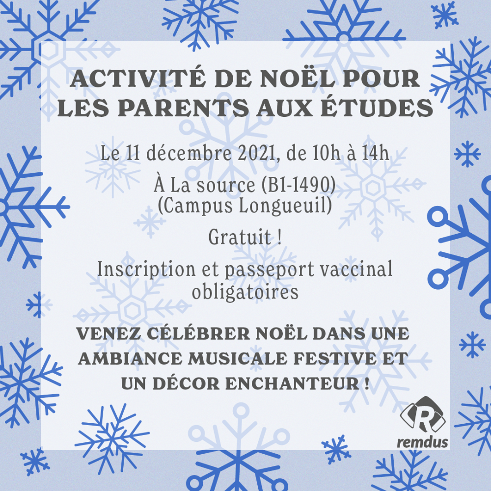 Pour le temps des Fêtes, le REMDUS invite les parents aux études, en compagnie de leur famille, à célébrer la magie de Noël dans une ambiance musicale festive et un décor enchanteur!