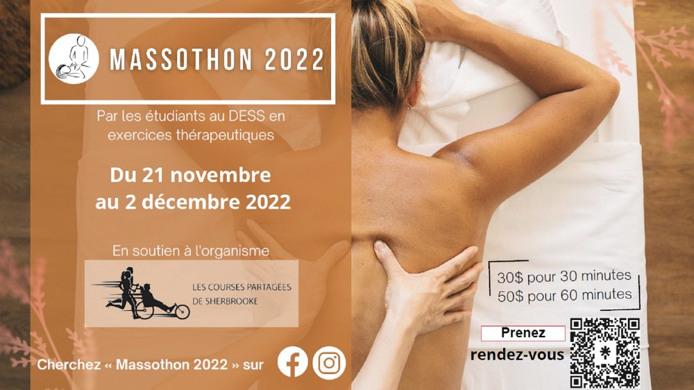 Du 21 novembre au 2 décembre, les étudiantes et étudiants en kinésiologie du 2e cycle se spécialisant en musculosquelettique organisent un massothon dont une grande partie des profits sera versée à l'organisme Les courses partagées.