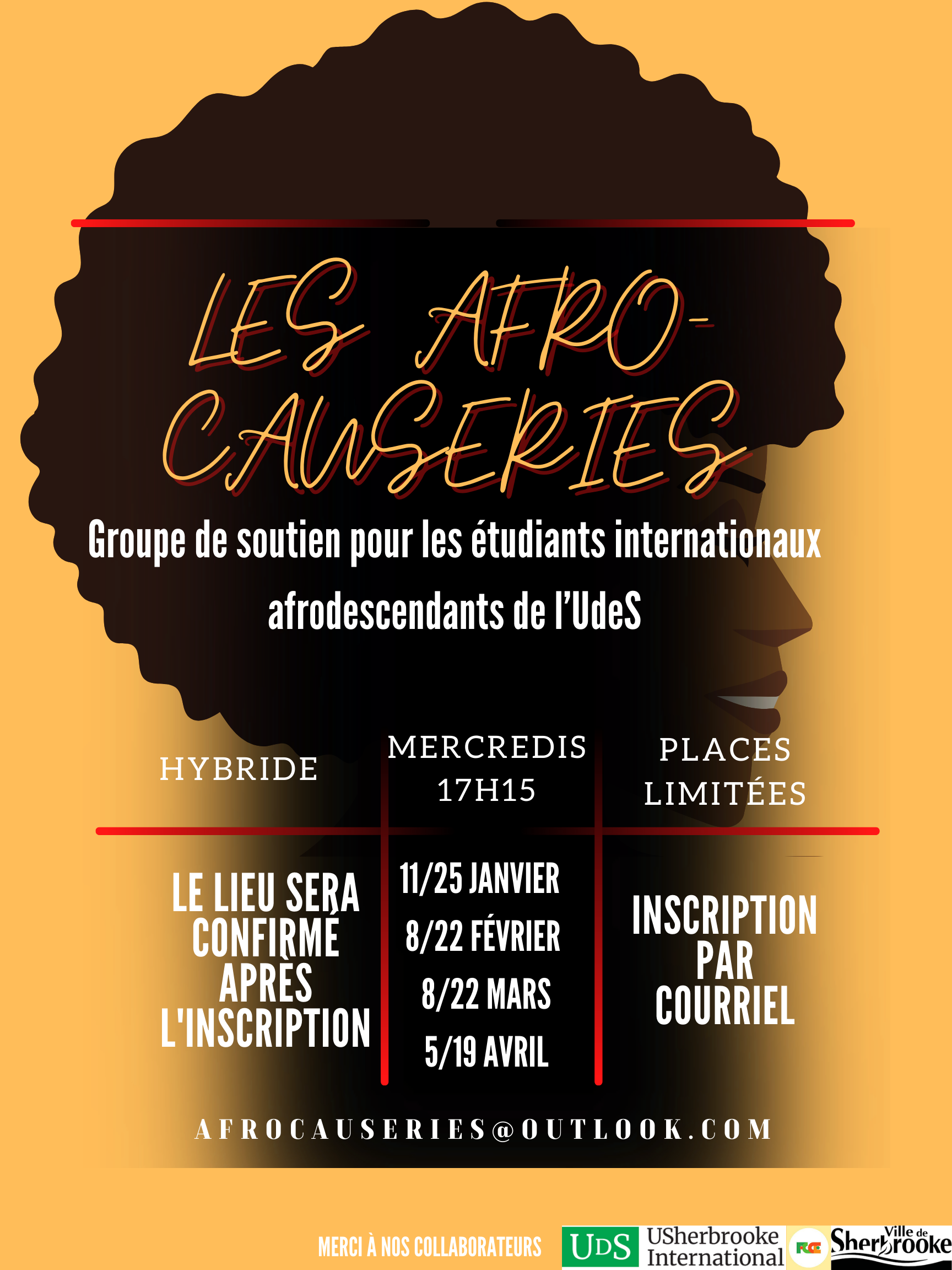 Un nouveau groupe de soutien qui offre un lieu d'échange et de rencontres pour les étudiantes et étudiants internationaux issus des communautés afrodescendantes de l’Université de Sherbrooke a été mis sur pied dernièrement. Il s'agit des Afro-Causeries.