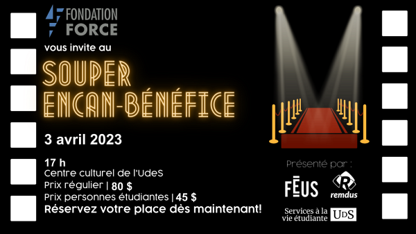C'est avec enthousiasme que la Fondation FORCE vous invite à vous procurer des billets en vue de son Souper et encan-bénéfice. Ce rendez-vous incontournable de la communauté universitaire et des partenaires de la Fondation FORCE fait son grand retour après trois ans d'absence.