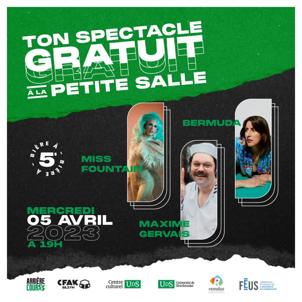 Miss Foutain vous éblouira avec un spectacle de drag-queen, Maxime Gervais vous fera rire aux éclats avec son humour absurde et Bermuda vous fera danser au rythme de ses chansons éclatantes! C’est un trio d’artistes à ne pas manquer!