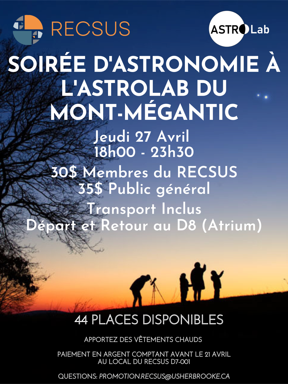 Le transport est inclus et le départ et le retour se feront au D8 (Atrium). Seulement 44 places sont disponibles, faites vite. Le paiement se fera en argent comptant avant le 21 avril au local du RECSUS au D7-0010. Merci d'écrire à promotion.recsus@USherbrooke.ca si vous avez des questions.