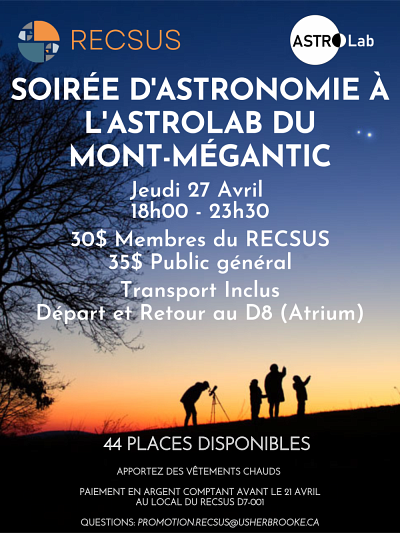 Le RECSUS est heureux de vous inviter à sa soirée d'astronomie à l'Astrolab du Mont-Mégantic, en plus de vous présenter la conférence qui aura lieu dans le cadre du KaféKak!
