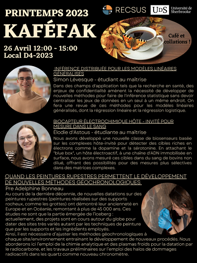 - Inférence distribuée pour les modèles linéaires généralisés par Simon Lévesque, étudiant de maîtrise au Département de mathématiques.