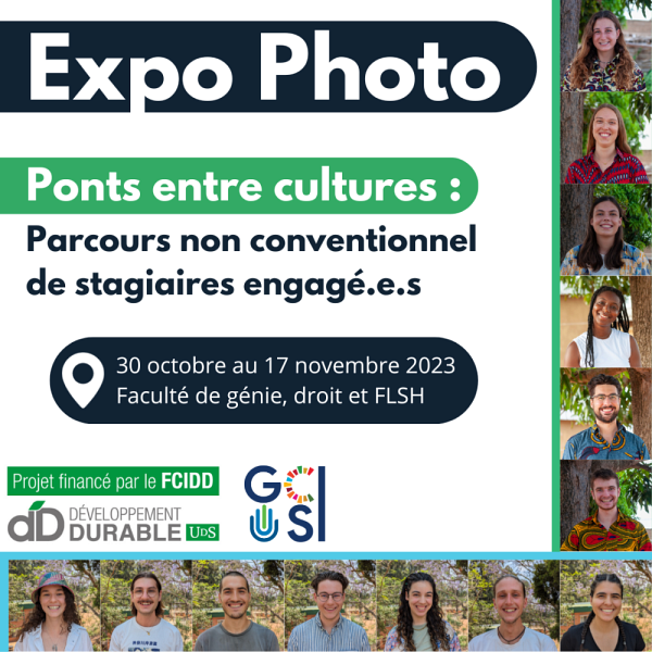 La communauté UdeS aura l'occasion de découvrir 13 portraits de personnes étudiantes engagées dans un stage de coopération dans la cadre de l'exposition de photos Pont entre cultures : Parcours non conventionnel de stagiaires engagés.