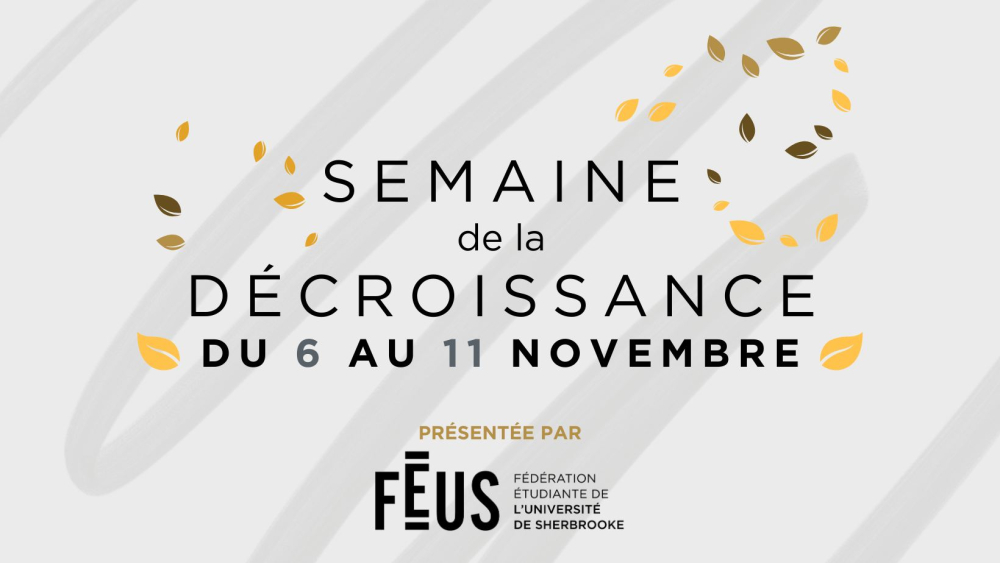 La Fédération étudiante de l’Université de Sherbrooke (FEUS) est fière d’annoncer la première édition de la Semaine de la décroissance. La FEUS invite toute la communauté à se joindre à eux en participant à une série d’activités prévues du 6 au 11 novembre!