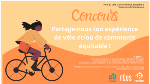 Vous vous déplacez à vélo en mai? Vous souhaitez mieux intégrer les produits issus du commerce équitable à votre quotidien? Peu importe votre niveau de motivation, faites-nous connaître vos objectifs, vos trucs et astuces, vos initiatives en lien avec ces deux thématiques en envoyant un courriel à cmd.udes@usherbrooke.ca.