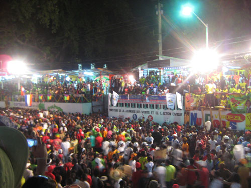 Preuve de joie en Haïti, les fêtes! Fête par-ci, bal par-là, il y a plusieurs programmes pour chaque soirée en Haïti. De plus, après quelques jours de travail, j'apprends que je suis en plein carnaval. Je vois tous ces gens sourire lorsque je leur demande ce qu'est le carnaval, et avec raison! Je l'ai ainsi découvert à mes dépens! Le carnaval en Haïti est quelque chose de sacré. Trois jours de festivités, où toute la diaspora haïtienne et tout le peuple haïtien se rassemble pour une seule raison : faire la fête et danser. Trois jours où toute violence est suspendue. Trois jours où des millions de personnes défilent dans les rues jour comme nuit, dansent et festoient comme jamais! Trois jours de paix, trois jours de fête. Il n'y a cependant pas beaucoup de Blancs dans un carnaval haïtien…