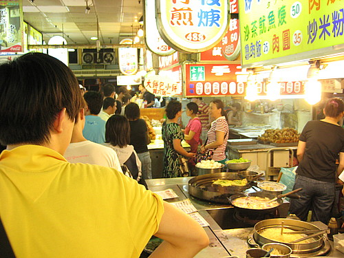 Après l'installation, la nourriture! Je fais alors ce que j'aime bien faire : avoir l'air de savoir où je vais, en n'ayant en fait aucune idée. Je fais la queue comme tout le monde et mon tour venu, je me contente de désigner quelque chose du doigt, de donner un billet de monnaie ni trop petit pour éviter la conversation, ni trop gros pour éviter de paraître comme le riche touriste, et de faire un beau sourire. Inutile de vous dire que ma recherche de fourchette fut infructueuse! Les rues de Taipei sont bondées de ce qu'on pourrait qualifier de cantines. Il est moins cher de manger dans ces endroits que de se préparer un repas. Tout le monde mange dans la rue. On ne s'éternise pas : on mange, et ensuite, on quitte pour laisser la place au prochain.