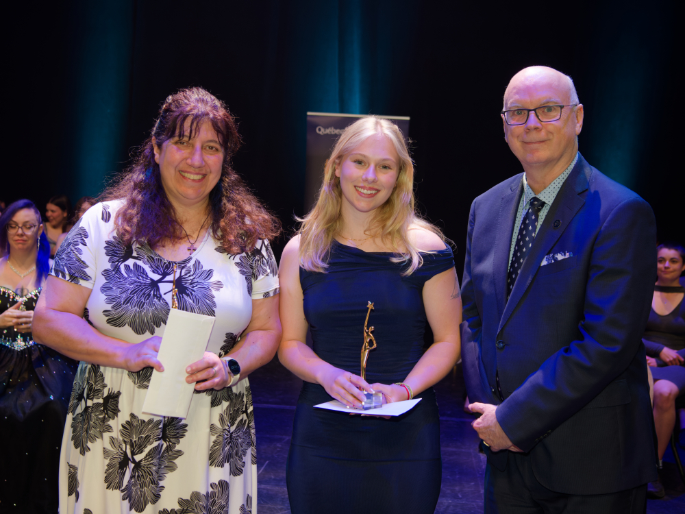 De gauche à droite : Sabrina Tochkov (lauréate absente représentée par sa mère Elissaveta Tochkova), Ève Berthiaume et Mario Asselin.