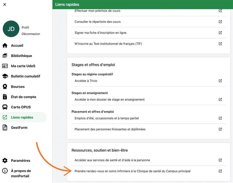 - Rendez-vous sur votre portail étudiant et, dans la colonne de gauche, cliquez sur Liens rapides.