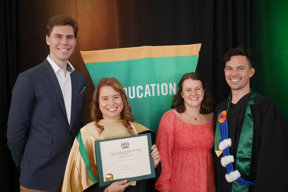 Le 24 septembre dernier avait lieu la collation des grades, une journée particulièrement importante pour Kassandra L’Heureux, membre étudiante à la Chaire de recherche sur l’éducation en plein air. Elle a célébré la fin de sa maîtrise à l'Université de Sherbrooke entourée du titulaire de la chaire, Jean-Philippe Ayotte-Beaudet, ainsi que des étudiants, Antoine Deschamps et Élise Rodrigue-Poulin, tous deux membres de la CRÉPA.