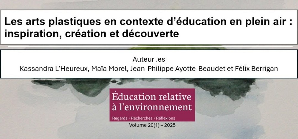 Un nouvel article de recherche, co-rédigé par des membres de la CRÉPA et de l’équipe de recherche interuniversitaire sur l'éducation en plein air, propose une immersion au cœur de l’enseignement des arts plastiques en plein air au primaire. Kassandra L’Heureux, Maïa Morel, Jean-Philippe Ayotte-Beaudet et Félix Berrigan y explorent comment la nature devient un véritable levier pédagogique.
