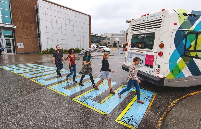 Dans le cadre de la Semaine de la mobilité durable, Rosalie Campeau, Valencia Edmond, Alexandra Tourigny-Fleury et Vincent Tremblay-Berthiaume, tous étudiants au certificat en arts visuels de l'UdeS, ont transformé une traverse piétonne afin de créer une expérience inédite et surprenante de la marche et de faire voir autrement le transport actif par la communauté universitaire.