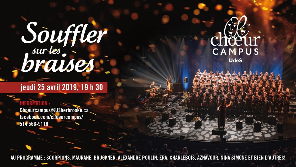 Le prochain concert se tiendra le jeudi 25 avril 2019 à 19 h 30, à la salle Maurice-O’Bready du Centre culturel de l’Université de Sherbrooke. Pour plus d’informations : Choeurcampus@USherbrooke.ca ou par téléphone au 819-821-8000, poste 62954 ou 514 566-9118.