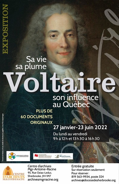 Voltaire n’échappera pas si aisément aux « quelques arpents de neige »! Il fera l’objet d’une exposition exceptionnelle à Sherbrooke, du 27 janvier au 23 juin 2022, au Centre d’archives Mgr-Antoine-Racine, une activité organisée en étroite collaboration avec le Département d'histoire et le Département des arts, langues et littératures de l'Université de Sherbrooke.