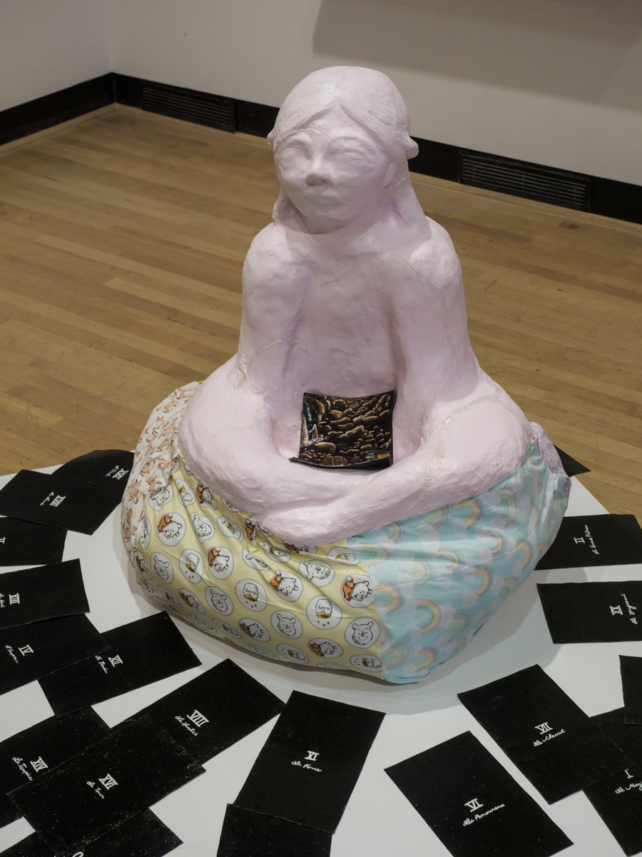 « Le tarot et les contes de fées faisant partie de nos passions communes, nous avons voulu réunir ces thèmes. Nous avons donc choisi d’illustrer les cartes de tarot en nous inspirant des personnages de contes pour enfants. Les vingt-deux arcanes majeurs, représentés sur des toiles abordant chacune une image d’histoire pour enfants, sont accompagnés de la sculpture d’argile d’une fillette. Devant ses cartes, la jeune fille, vous plonge dans son univers imaginaire d’ésotérisme, de divination et de conte de fées. Les spectateurs sont invités à choisir une carte qui, à la manière d’un jeu de tarot, offrira une pensée sur laquelle méditer. »