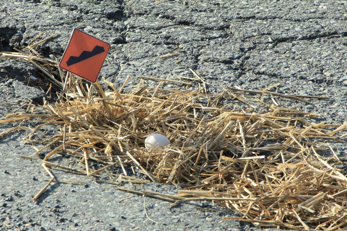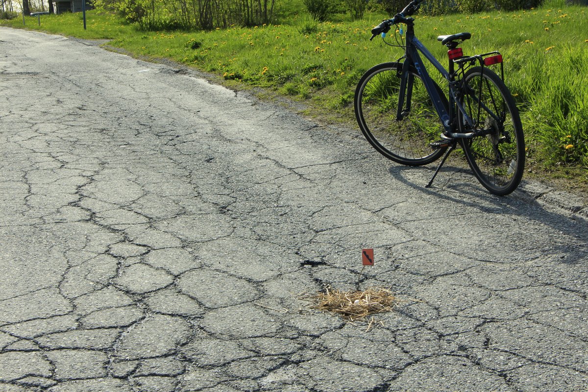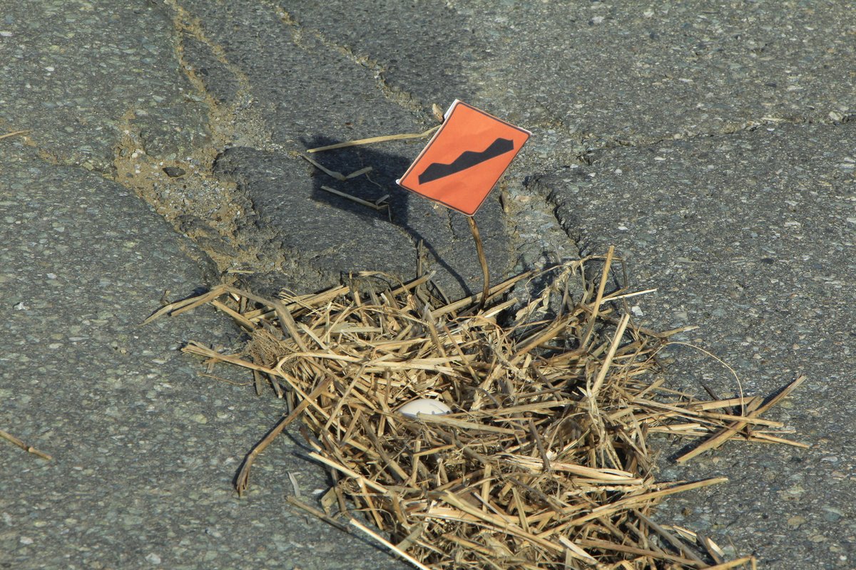 Mon processus, rendre visible l’invisible, a consisté en un remplissage de quatre différents nids de poules trouvés sur ma route à partir de mon quartier résidentiel dans le nord de Sherbrooke en descendant vers le centre-ville. J’ai rempli ces trous de paille avec un œuf de poule pour jouer avec le vocabulaire et illustrer un jeu de mots, et j’y ai affiché une version miniature de la pancarte utilisée par les autorités avertissant une chaussée cahoteuse. Travaillant en plein jour, j’espérais initier des conversations, mais j’ai seulement attiré des regards méfiants. Ma recherche de ces nids de poules s’est effectuée en vélo afin d’intégrer et vivre pleinement l’expérience.