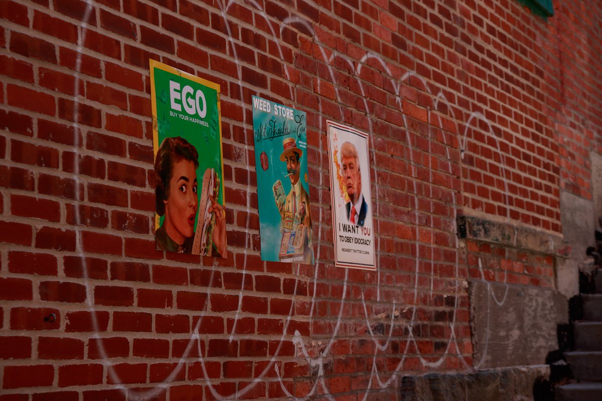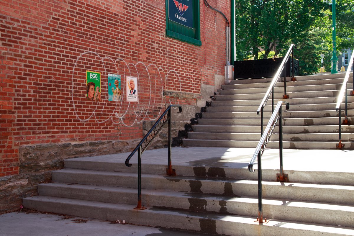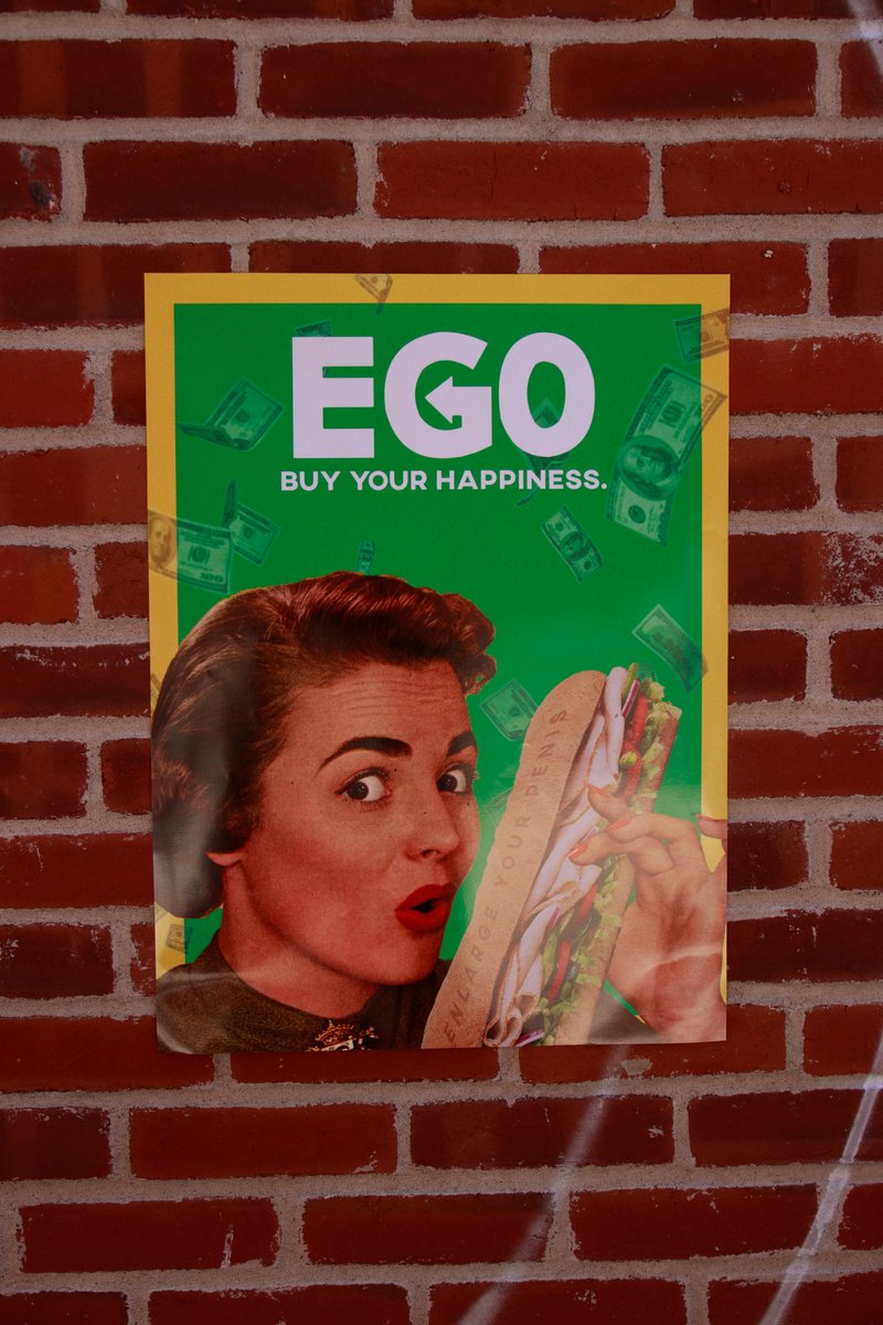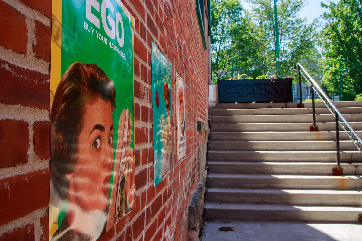 L’œuvre prend place dans un passage qui mène au stationnement de la Grenouillère tout près de la rue Wellington Nord, au centre-ville de Sherbrooke. Issu du milieu des communications et de la publicité, je dénonce avec ce projet le système capitaliste perverti par l’appât du gain, qui tente par toutes sortes de façons de manipuler le public. L’installation présente différentes affiches commerciales qui détournent le contenu d’affiches anciennes et célèbres telles que celle de James Montgomery Flagg (US Army: I want you) ainsi que celle de John Howard Miller (We can do it). Installées sur le mur de briques, les affiches ironisent sur les aspects, les codes, voire les acteurs de la société moderne.