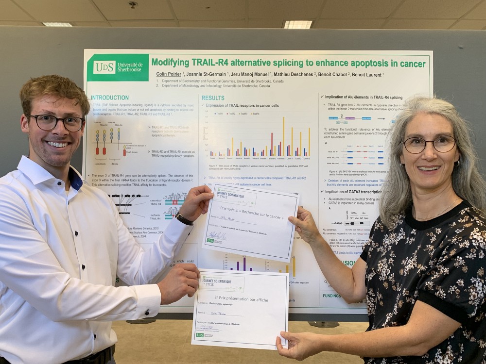 Lors de cette même activité, Colin Poirier s'est mérité 2 prix, soit celui du 3e Prix de présentation par affiche, prix de 100$, ainsi qu'un prix de 250$ pour le Prix "Recherche sur le Cancer" remis par l'IRCUS. Colin a fait ses stages dans le laboratoire du Pr Benoit Laurent.